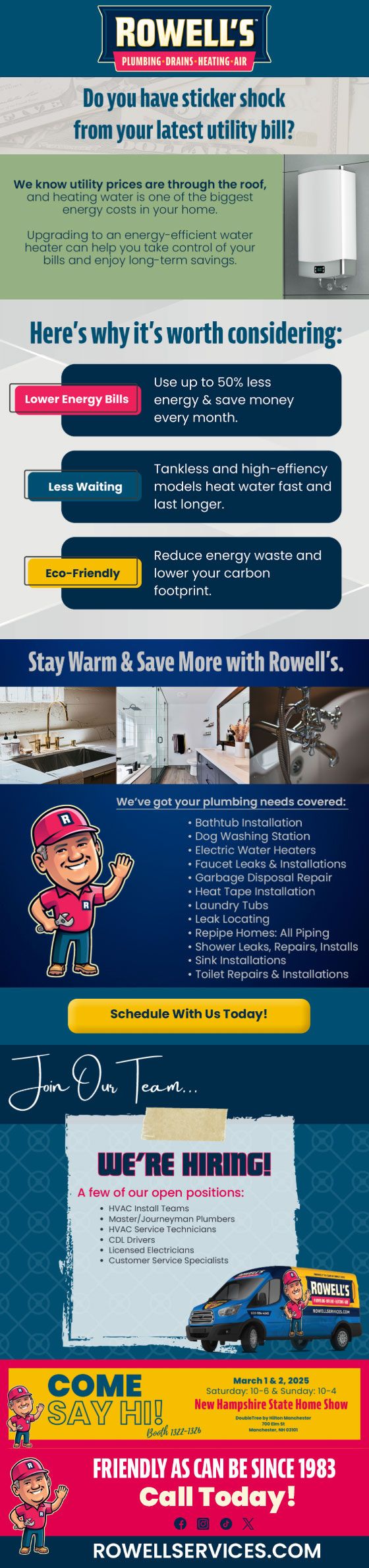 "Friendly As Can Be Since 1983!" When you need help with your plumbing, drains, heating, cooling or electrical in New Hampshire, you can always rely on Rowell's Services! Call us now or book online!